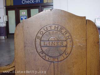 each end, the logo of the Southern Pacific Railroad is carved into the